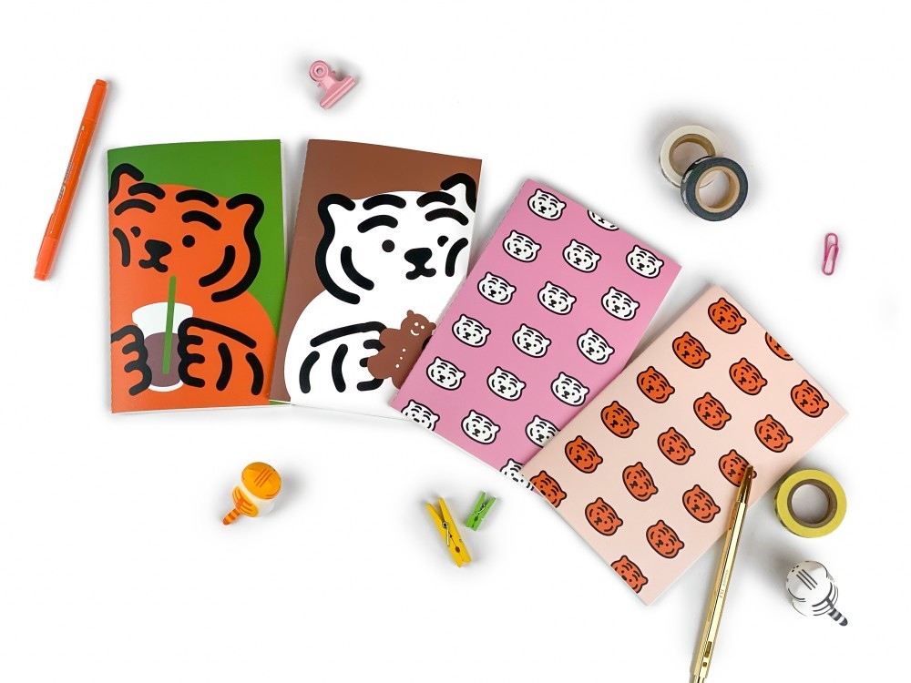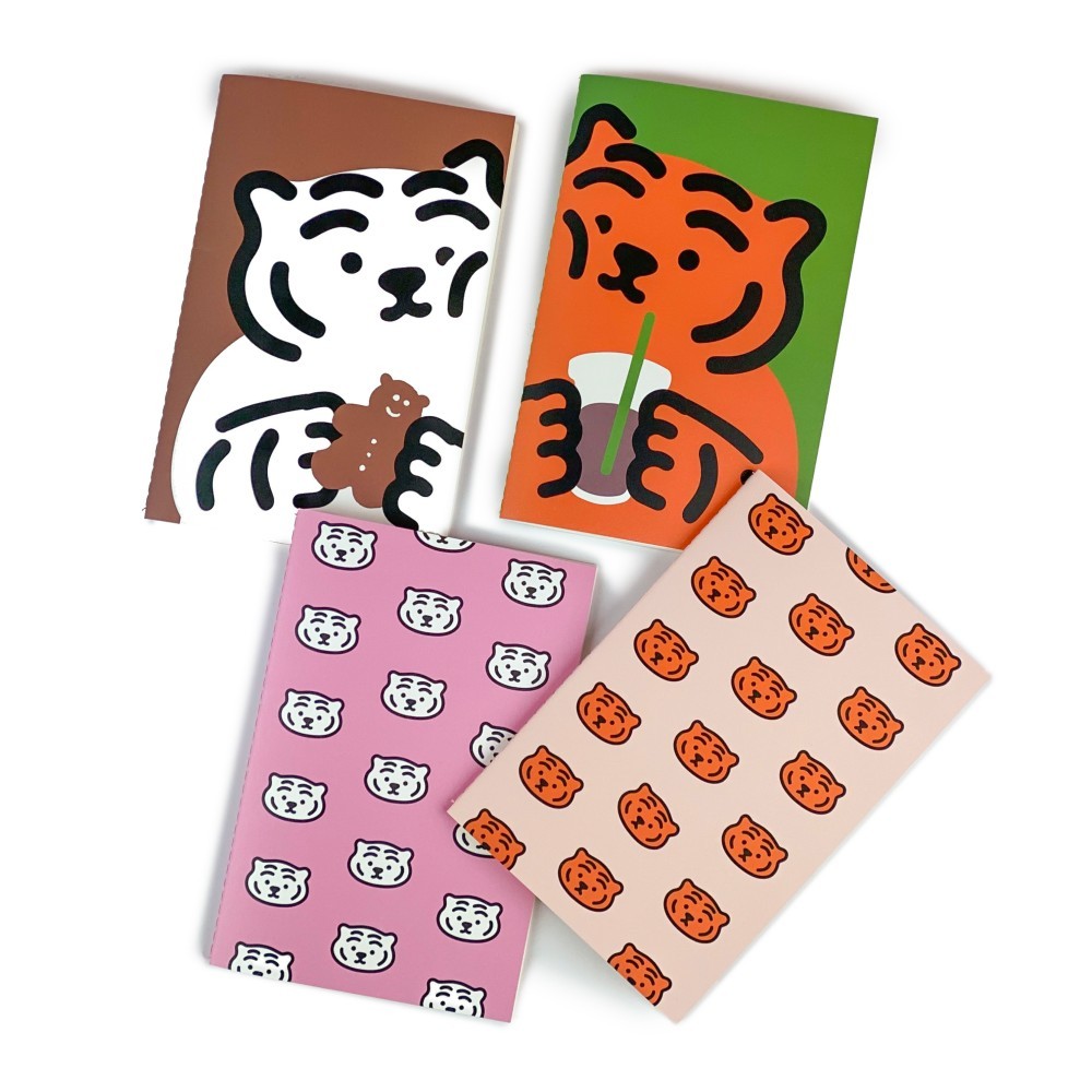 무직타이거의 미싱노트 시리즈입니다. 30년 문구명가 '오롬'과의 콜라보레이션으로 심플하지만 퀄리티있게 제작된 노트입니다. 뚱랑이 얼굴이 패턴화되어 들어간 유선노트 2종, 아메리카노와 쿠키를 들고있는 뚱랑이가 가득 채워진 무선노트 2종으로 제작되었습니다.