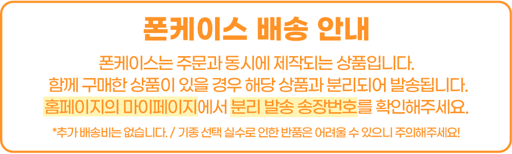 폰케이스는 주문제작 방식으로 구매 후 취소가 어려우니 신중히 결정하여 주시기 바랍니다. 기종을 착각하여 제품을 받아보시고 문의주는 분들이 많습니다. 이 경우 반품 또는 교환의 사유가 되지 않습니다. 반드시 기종 확인 후 주문 부탁드립니다.
