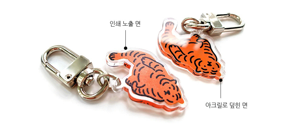 아크릴 키링 제작 방식 상 양쪽 표면의 질감이 상이합니다. 한 면은 인쇄가 노출되고 다른 한 면은 아크릴로 덮힌 방식입니다. 이는 제작 공정상의 자연스러운 현상으로 불량이 아니므로 교환/환불이 불가합니다.