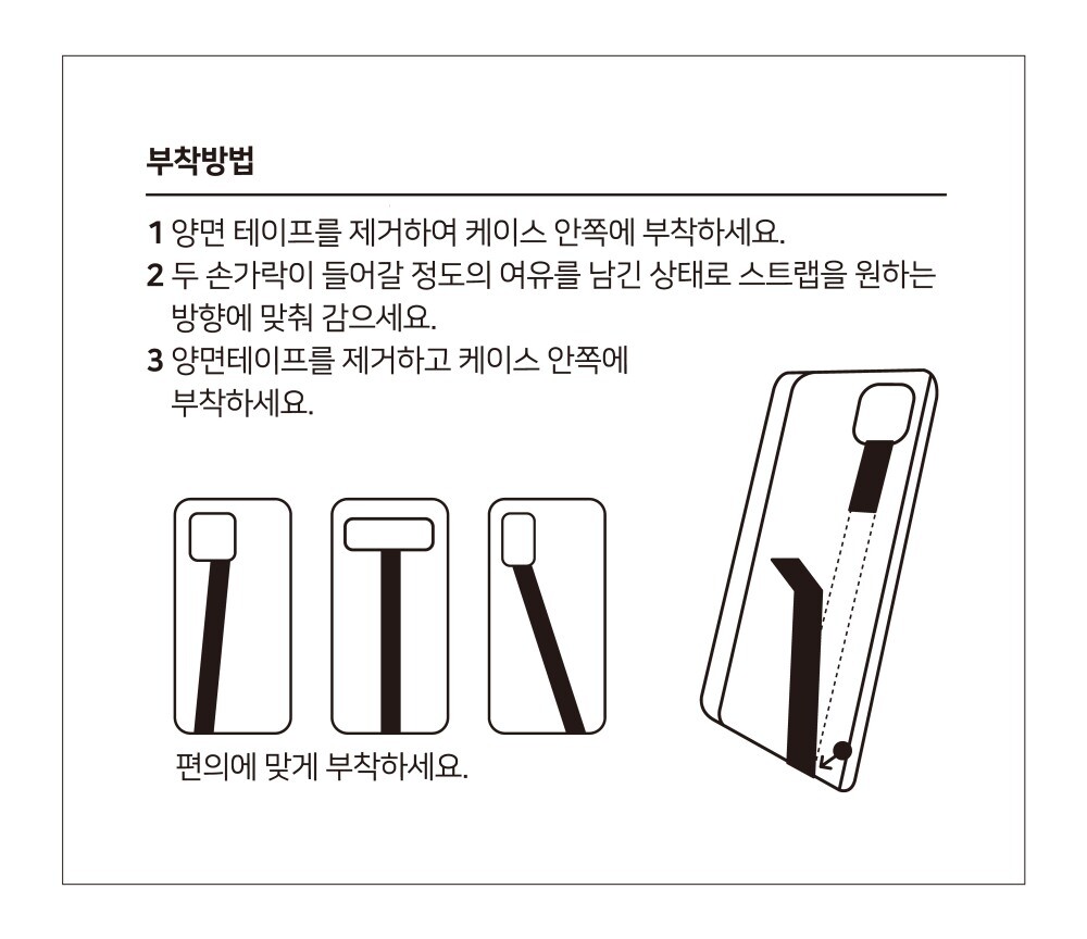 내부가 스웨이드 재질인 휴대폰 케이스에 스트랩 부착 시 테이프의 접착 부분으로 인해 스웨이드 재질에 손상이 갈 수 있습니다. 이로 인한 교환 및 반품이 불가하니 신중한 구매 부탁드립니다.