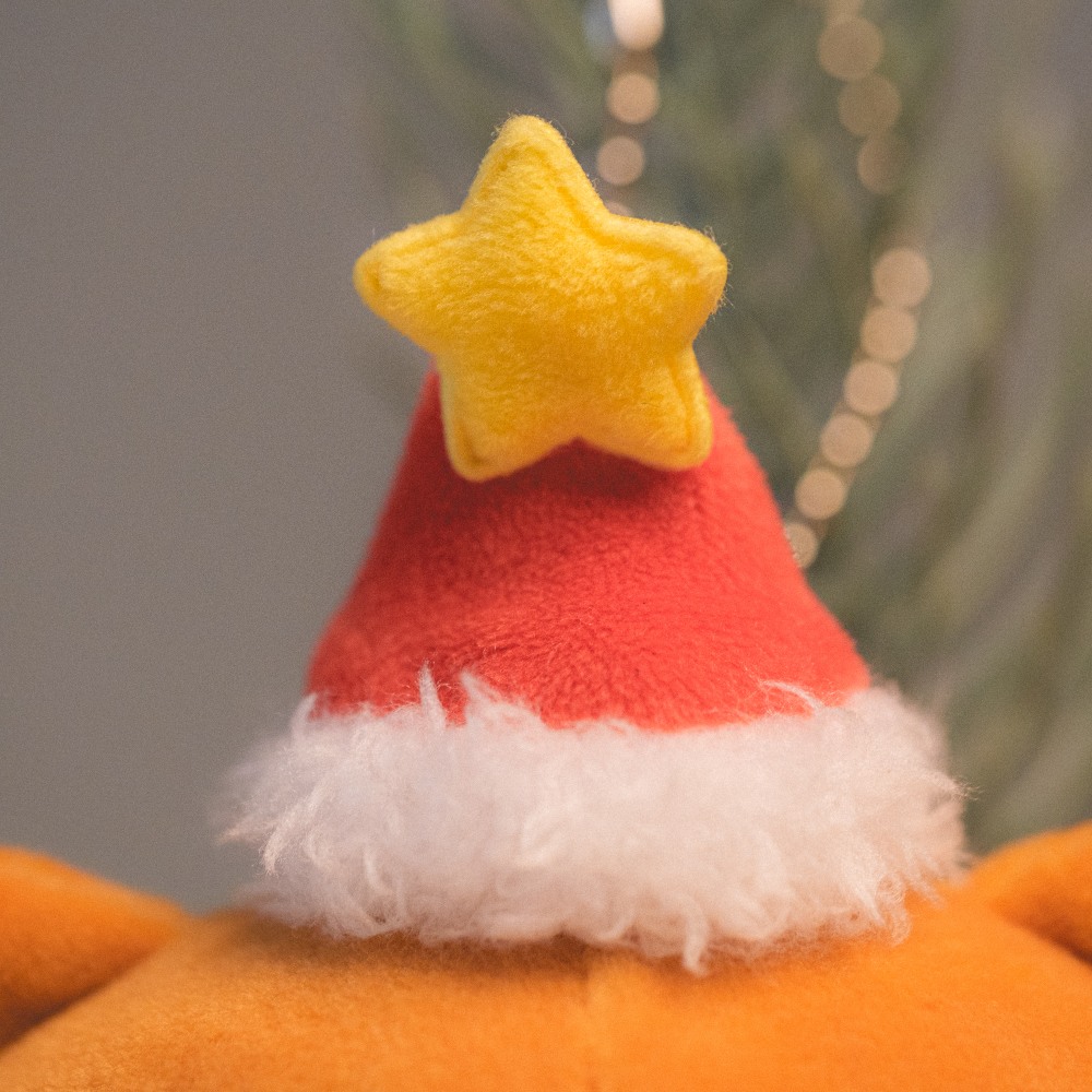 뚱랑이는 산타가 되기 위해 붉은 망토와 별이 반짝이는 산타 모자를 열심히 만들었다고 해요. 자세히 보면 망토 아래 앙증맞은 팔다리, 그리고 꼬리가 있답니다.
