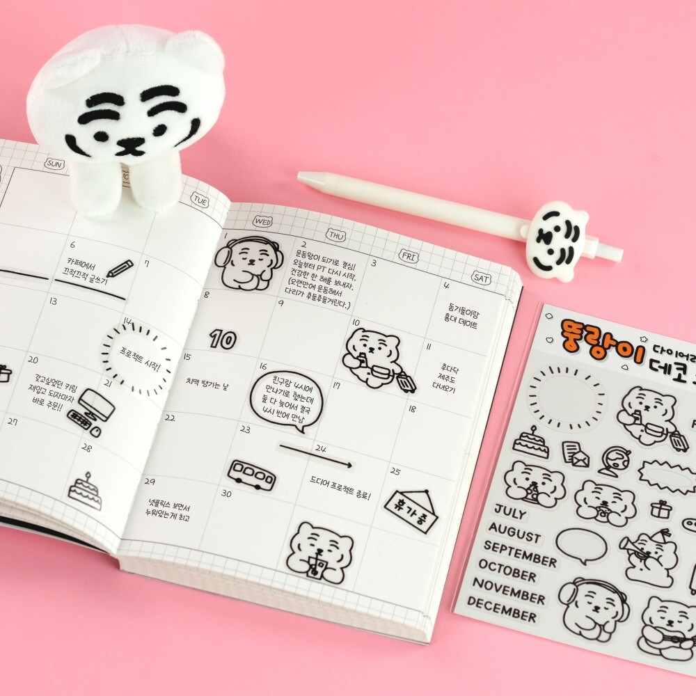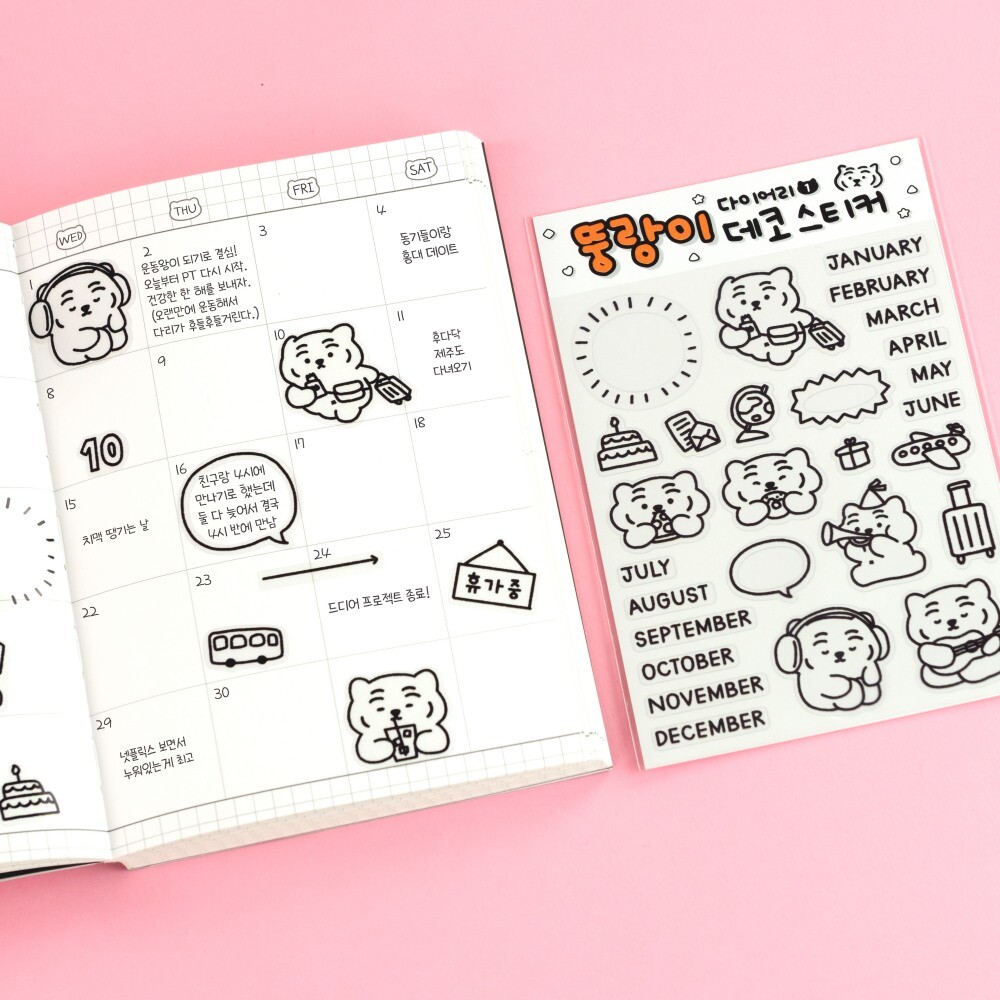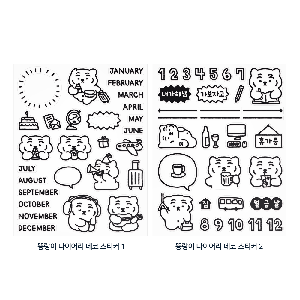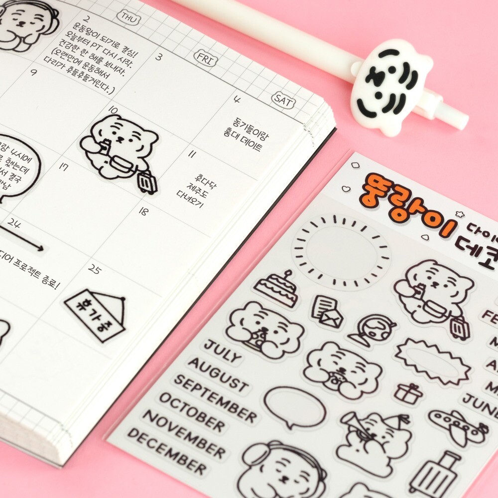 무직타이거의 다이어리 데코 스티커 시리즈입니다. 투명 무광 스티커로 제작되어 손글씨처럼 자연스러워요. 뚱랑이와 함께 한 해를 꾸며보아요 :)