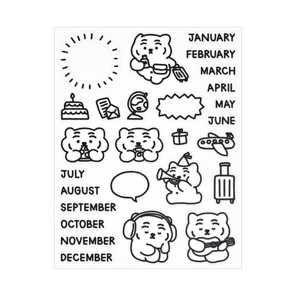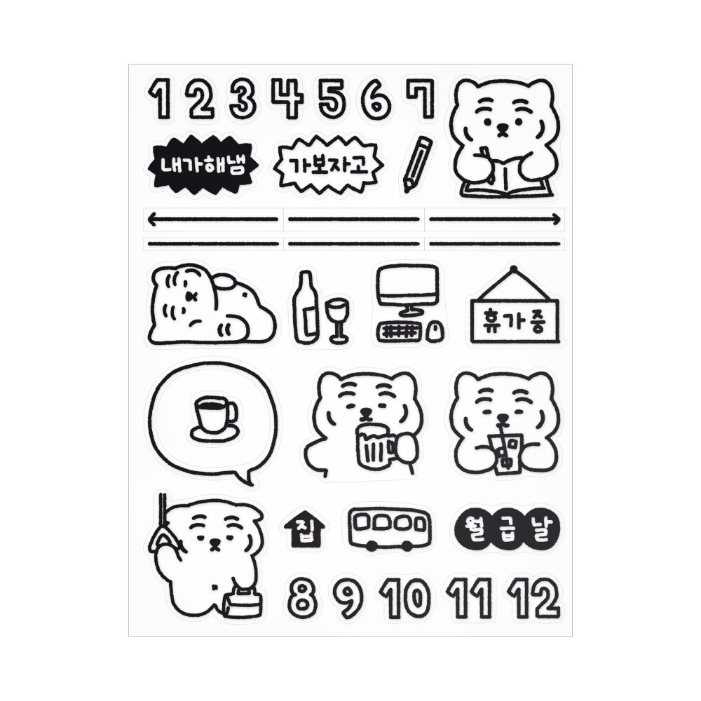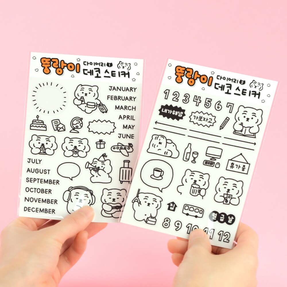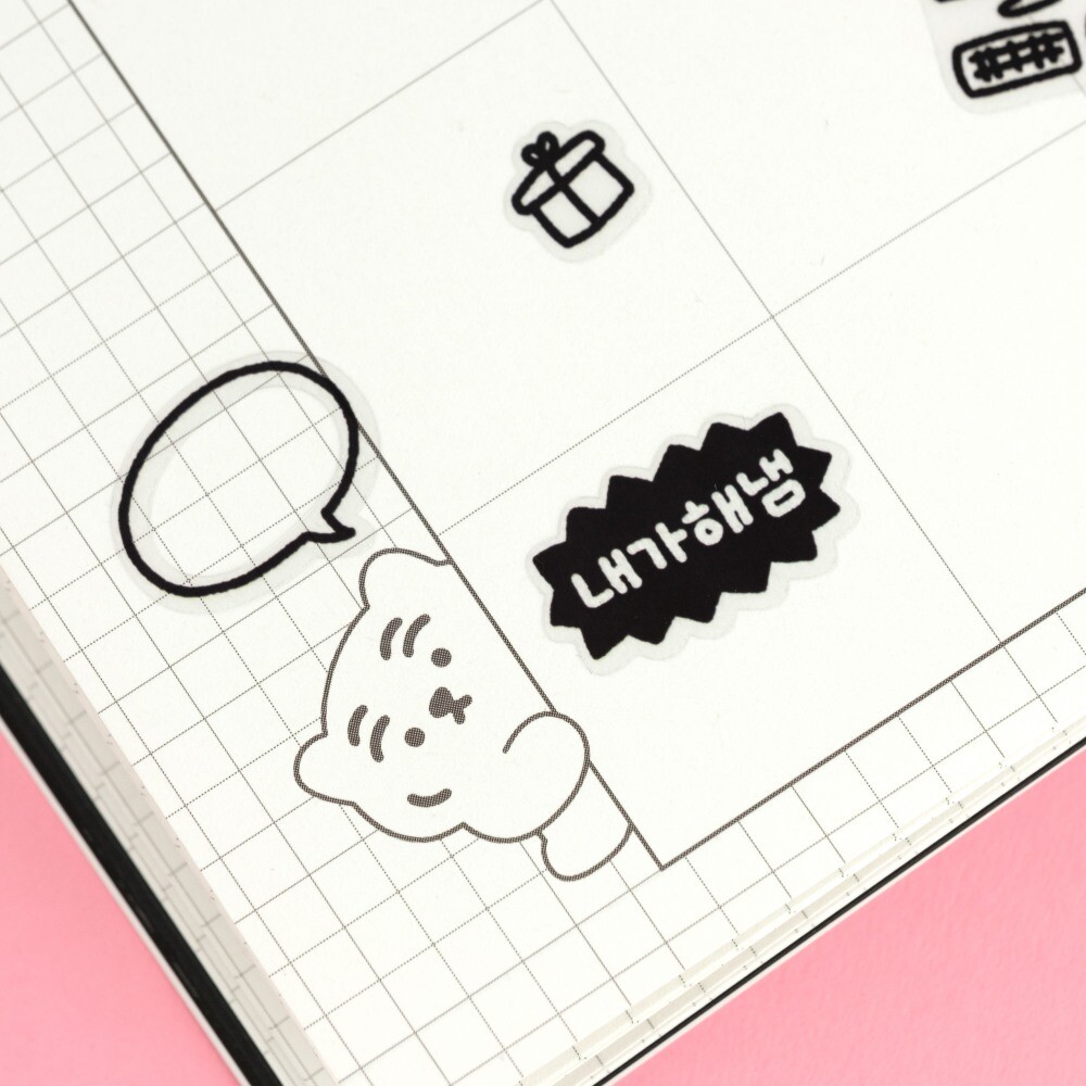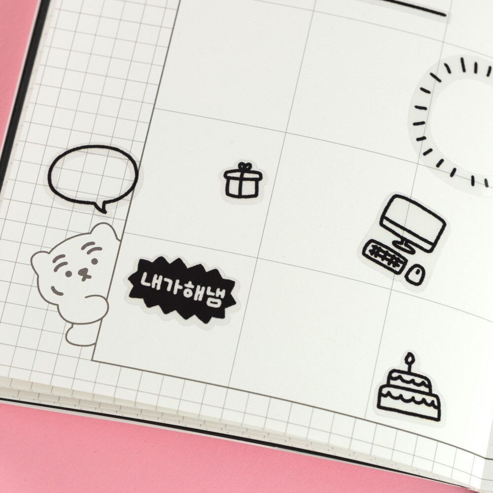 무직타이거의 다이어리 데코 스티커 시리즈입니다. 투명 무광 스티커로 제작되어 손글씨처럼 자연스러워요. 뚱랑이와 함께 한 해를 꾸며보아요 :)
